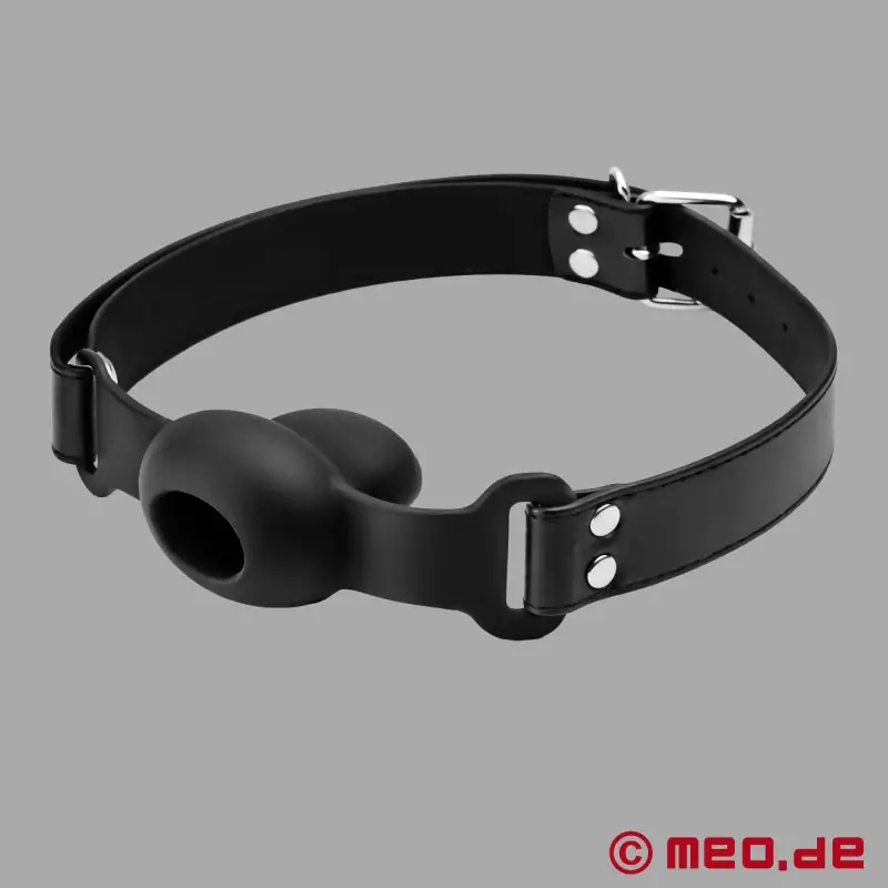Tento dutý ústny roubík je vytvarovaný tak, aby umlčal vášho partnera bez toho, aby ho unavil alebo zranil čeľusť. Otvorený stred ústneho roubíka mu umožňuje dýchať a znižuje prípadnú úzkosť, čo mu umožňuje dlhšie sa s vami "hrať".