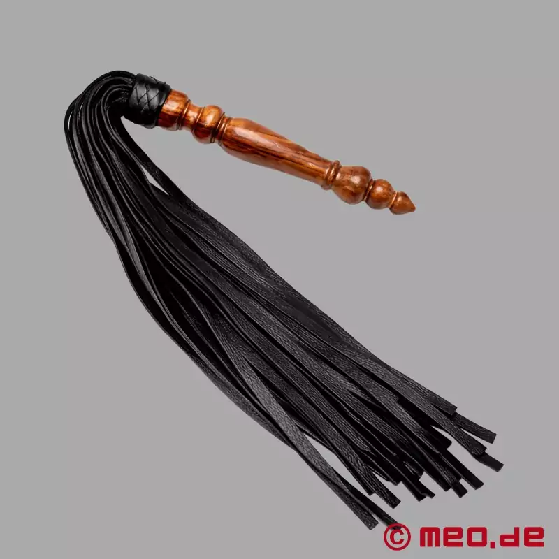 BDSM flogger "CrimsonCaress" zaujme svojou vysokou kvalitou a estetickým dizajnom. Má hnedú, umelecky spracovanú drevenú rukoväť, ktorá je s koženými remienkami floggera spojená elegantným koženým bižutérnym uzlom. S celkovou dĺžkou 71 cm, dĺžkou floggera 46 cm a drevenou rukoväťou 25 cm ponúka tento flogger vynikajúcu rovnováhu a manipuláciu. Priemer drevenej rukoväte 37 mm zaisťuje bezpečné a pohodlné uchopenie, ktoré je dôležité najmä pri dlhších výpraskoch.