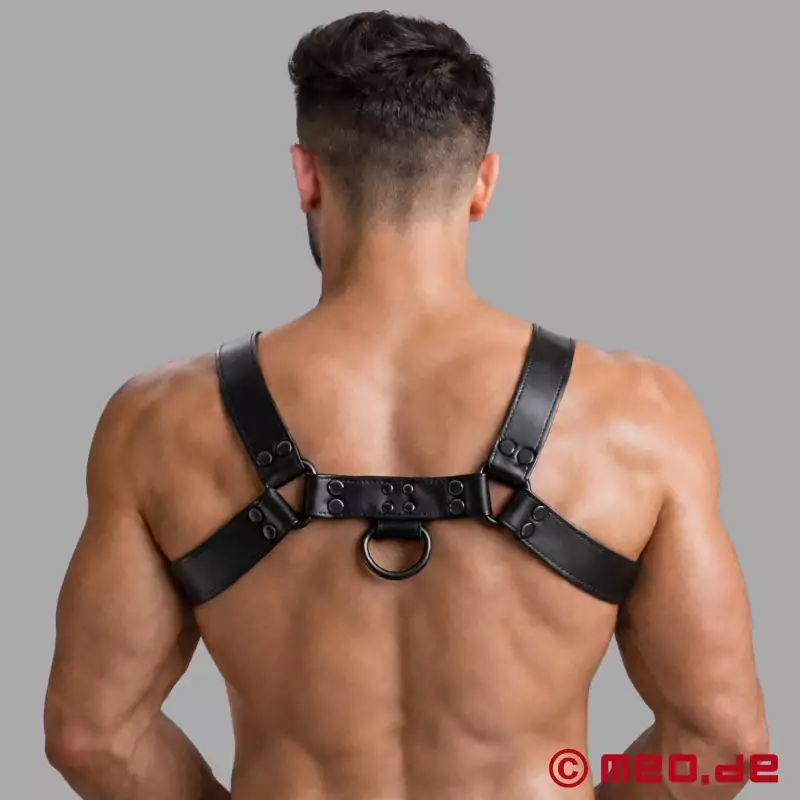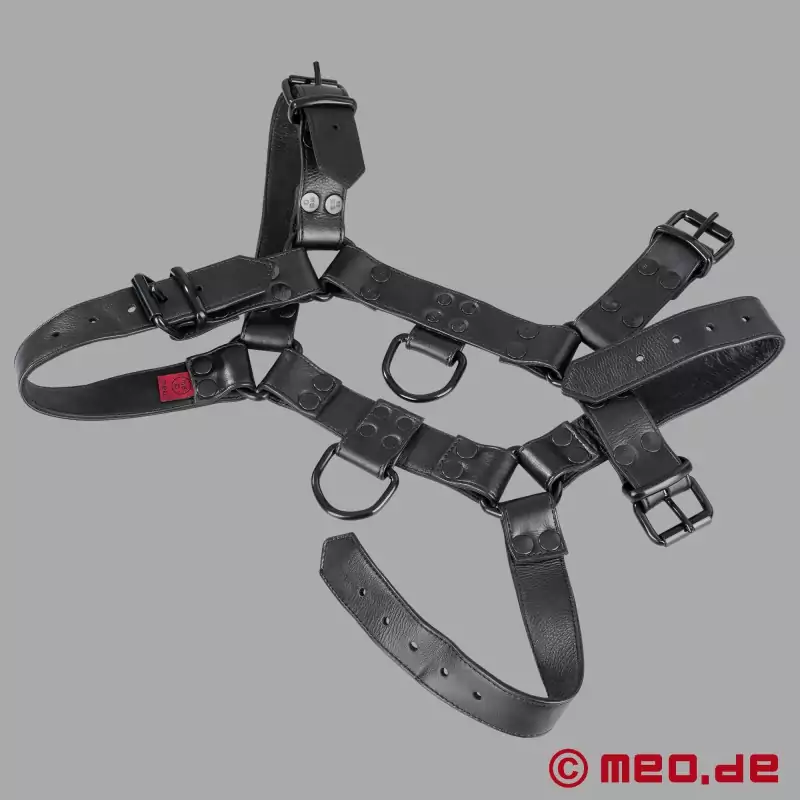 The Fetish Gear Harness in full black by MEO® Germany embodies pure dominance and understated power. Crafted from triple-layer calf leather and solid steel hardware, this upper body harness turns your chest and shoulders into a statement of control. Whether at a private dungeon or a public play event, its all-black design demands attention - without saying a word. Perfect for those who appreciate the timeless elegance of black-on-black gear that speaks pure authority.