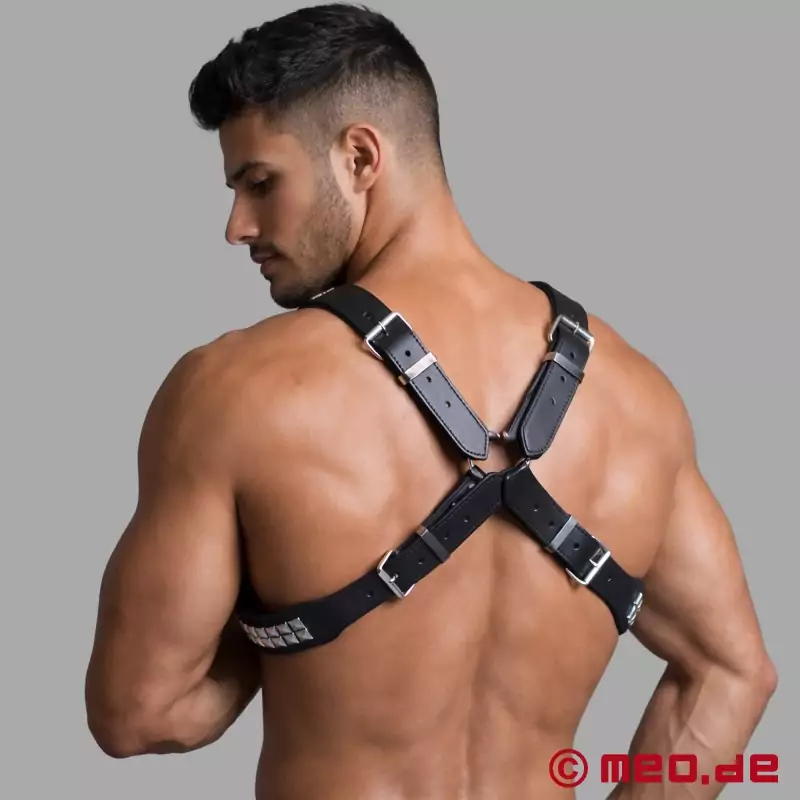 Tento krásny kožený postroj pre mužov je ideálny na ďalšiu fetiš párty! Náš kožaný postroj s cvočkami je klasický postroj na hornú časť tela, ktorý zvýrazňuje hruď, horné časti paží, chrbát a six-pack. Skvelý všestranný kožený postroj, ktorý zaujme svojou kvalitou a cenou.