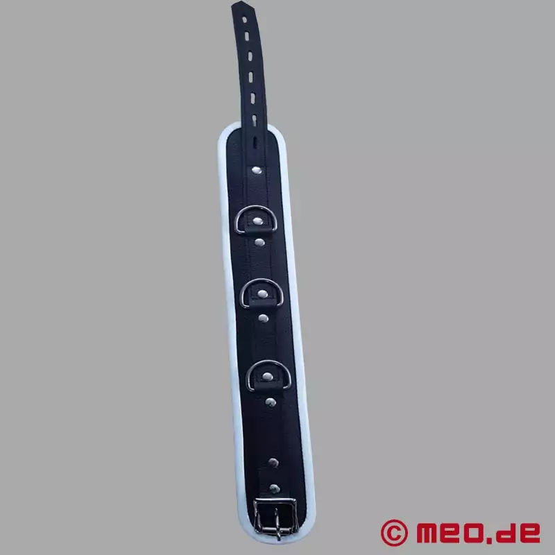 Čierno-biely kožačný obojok BDSM zaujme svojou klasickou eleganciou a jemným farebným prevedením. Subjekt má prospech z vysokej úrovne pohodlia, aj keď sa obojok BDSM musí nosiť dlhší čas. Náš obojok BDSM je vybavený 3 krúžkami, ktoré jasne ukazujú, že sub patrí milenke alebo pánovi, rovnako ako v príbehu O.