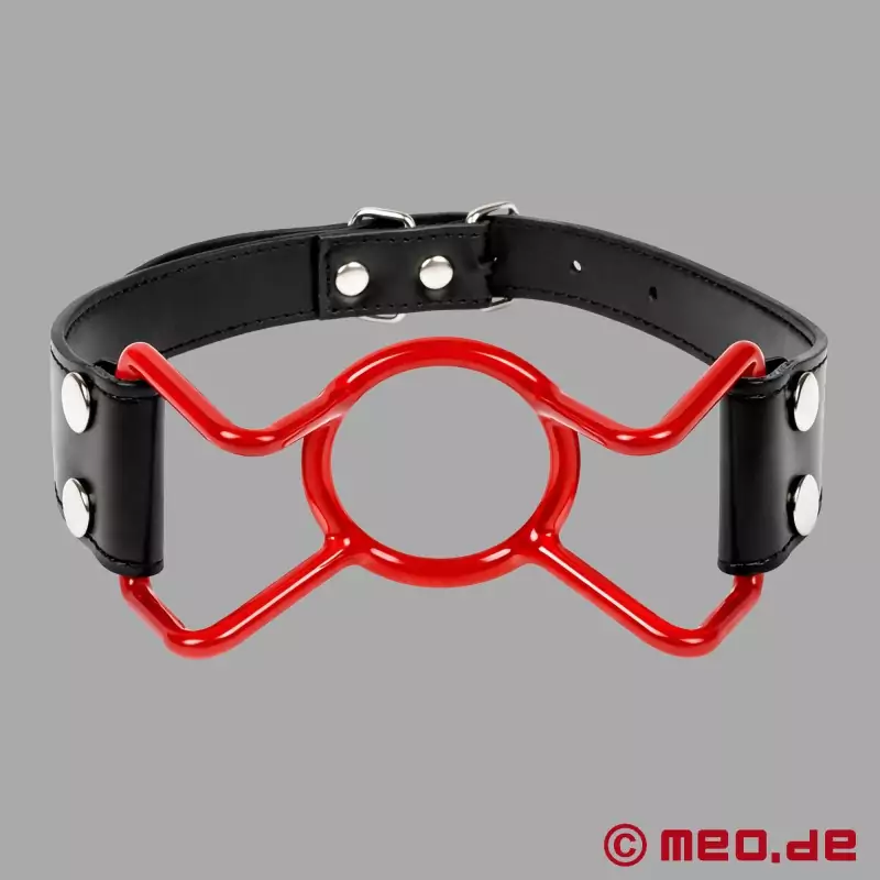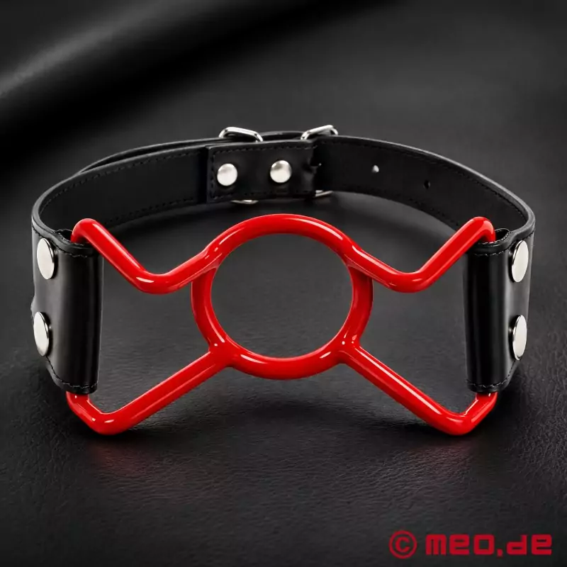 Táto kombinácia Cock Ring a rúško udržuje ústa široko otvorené. Krúžok roubíka a kovové vzpery po stranách nášho rúška "Mouth Wide Open" sme pokryli červeným plastovým poťahom.