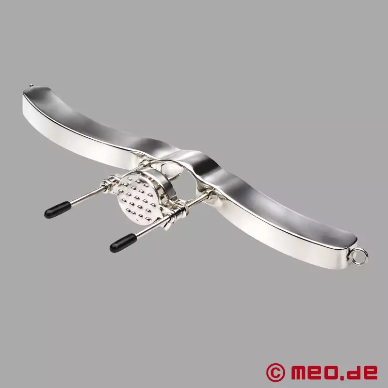 S Ultimate Humbler od MEO® nielenže dostanete každého submisívneho muža na kolená, ale ho tam aj udržíte. Táto BDSM pomôcka 4 v 1 kombinuje fixáciu semenníkov, natahovač semenníkov a tlak v elegantnom dizajne z lešteného hliníka. Pohyby bez povolenia? Nemožné. Semenníky sú bezpečne zafixované medzi stehnami a miešok sa dá natiahnuť plynule - až na 120 mm. Voliteľné hroty na prítlačnej doske navyše zabezpečujú intenzívne zážitky z CBT. Či už samostatne, alebo v kombinácii s inými BDSM hračkami: Pre všetkých, ktorí to s dominanciou myslia vážne